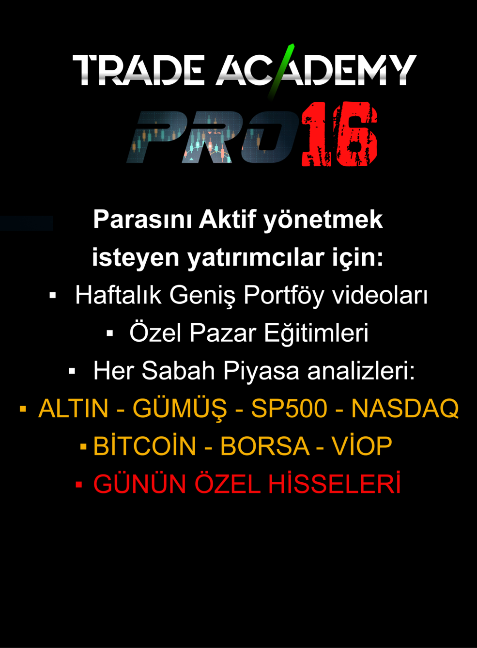 Yaklaşık iki yıl önce başlayan "Trade AcademyPRO" eğitimlerinin tümüne katılan ve halihazırda devam eden biri olarak en son aldığımız "PROFESYONEL" eğitimi sermaye piyasalarına çok daha kapsamlı bakışımızı sağlamış, Global piyasa analizinin önemi ve birbirleriyle olan korelasyon ayrışmalarının tespiti konusunda ekstra katkılar sağlamıştır. Özellikle bizim gibi küçük yatırımcılar i.in çok önemli olan hisse seçimi kriterlerini tüm ipuçları ve hilelerini deneyimleme imkanı sağlamıştır. Eğitimi pekiştirmek için yapılan sabah ve akşam CANLI seans açılışlarında yapılan arbitraj işlemleri dahil, kendisinin 25 yılı aşkın tecrübelerini tüm yönleriyle bizimle paylaşmış olan BURAK ARSLAN hocamıza çok teşekkür ediyoruz. Bu eğitimin bize kazandırdıklarının PAHA BİÇİLEMEZ olduğunu da vurgulamak isterim.